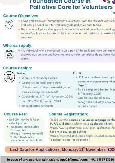 Well, we invite you to register yourself and also encourage others to apply for the 'IAPC's Foundation Course in Palliative Care for Volunteers' to get empowered in the basics of palliative care and take steps towards creating a compassionate community.
